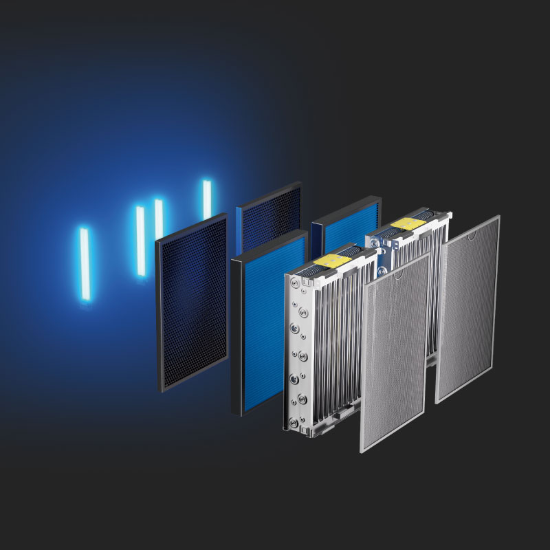 两套金属预过滤器 / 两套两段式静电吸附装置 / 两套HEPA滤芯 / 两套活性碳滤网 / 4支紫外灯管