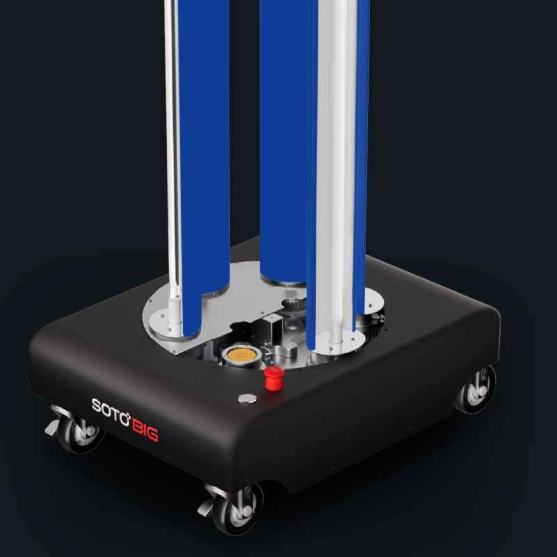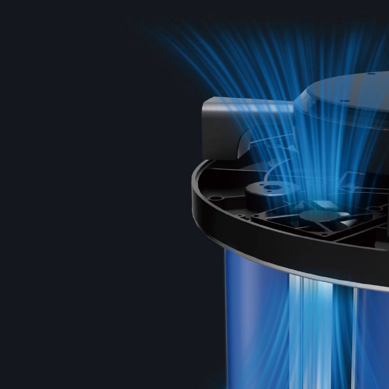 设备配备六支高功率紫外灯管,360°均匀垂直排列,实现快速杀菌;顶部设三个直流风扇,用于散热和促进空气流通;并配备四个摄像头实时监测人员活动,检测到人体时自动关闭灯管,保障安全。